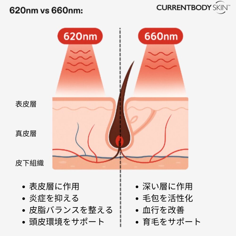 この赤い光は、頭皮の奥までじんわりと届き、血行を促進したり、髪の成長を指示する毛乳頭細胞の活性化を促したりする効果が期待されています。カレントボディのLEDデバイスは、120個のLEDを使用し、頭皮全体にまんべんなく光を当てる構造なので、効率よく髪が育ちやすい「土台づくり」をサポートしてくれます。